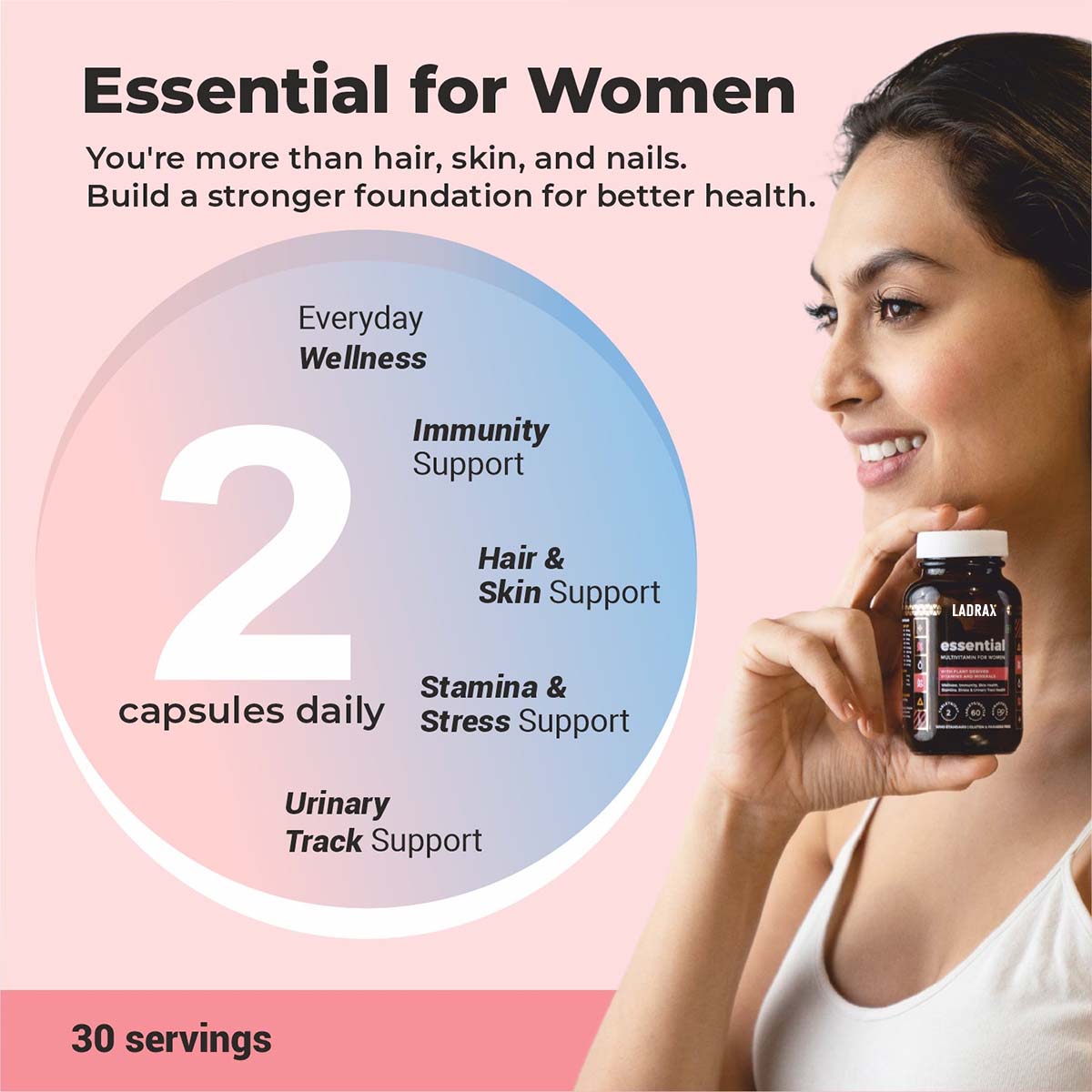 Embrace a new era of multivitamins with Ladrax Essential for women – where less is more, and only the essentials are packed to promote women’s health, vitality and a balanced life.